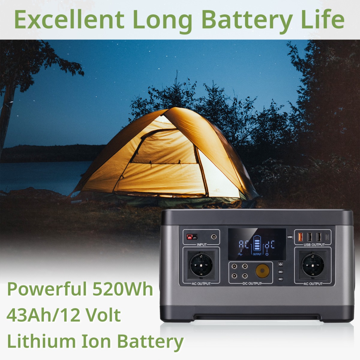 The powerful 520Wh 43Ah/12Volt (140400mA/3.7V) lithium-ion battery reliably stores your energy reserve. It is charged within 8 hours with the included 230V charger or 12V car battery charging cable. Thanks to the built-in solar charge controller, you can also charge the Power Station directly using a solar panel (available as an option). A clear display shows you all relevant information such as the battery charge status, battery charging process, USB output ON/OFF and AC/DC output ON/OFF.