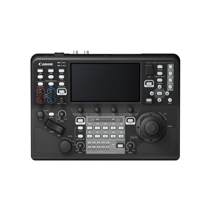 by CanonControl and monitor up to 200 cameras using this professional PTZ controller with a 7-inch multi-function touchscreen, an ergonomic joystick and zoom rocker plus buttons and dials for precise control.