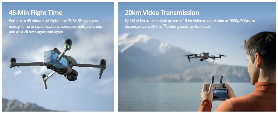 | Max Flight Time | 45 minutes<br><br> <sup>Measured by DJI Air 3S flying forward at a constant speed of 32.4 kph in a windless environment at sea level, with Obstacle Avoidance Action set to Brake, in photo mode, and from 100% battery level until 0%. Data is for reference only. Always pay attention to reminders in the app during your flight.</sup> |