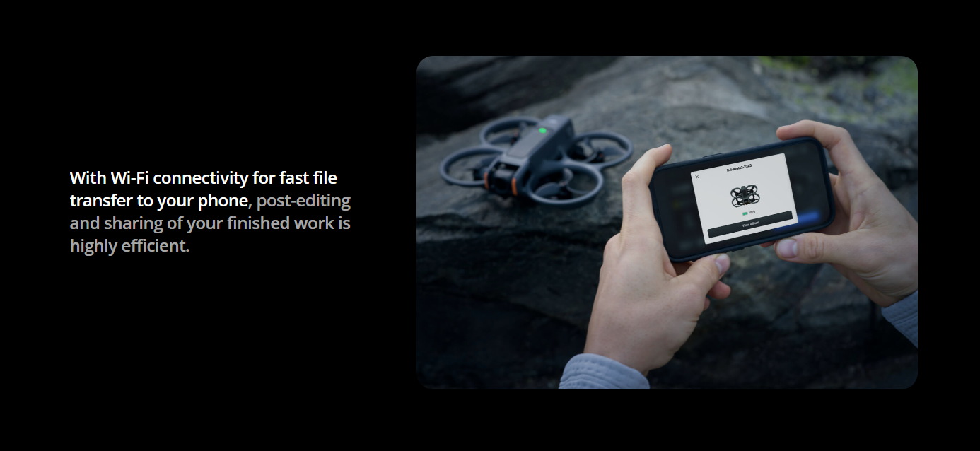 When Avata 2 is connected wirelessly to LightCut, you can preview the captured footage within the app and edit it without the need to download the footage, saving valuable space on your smartphone.