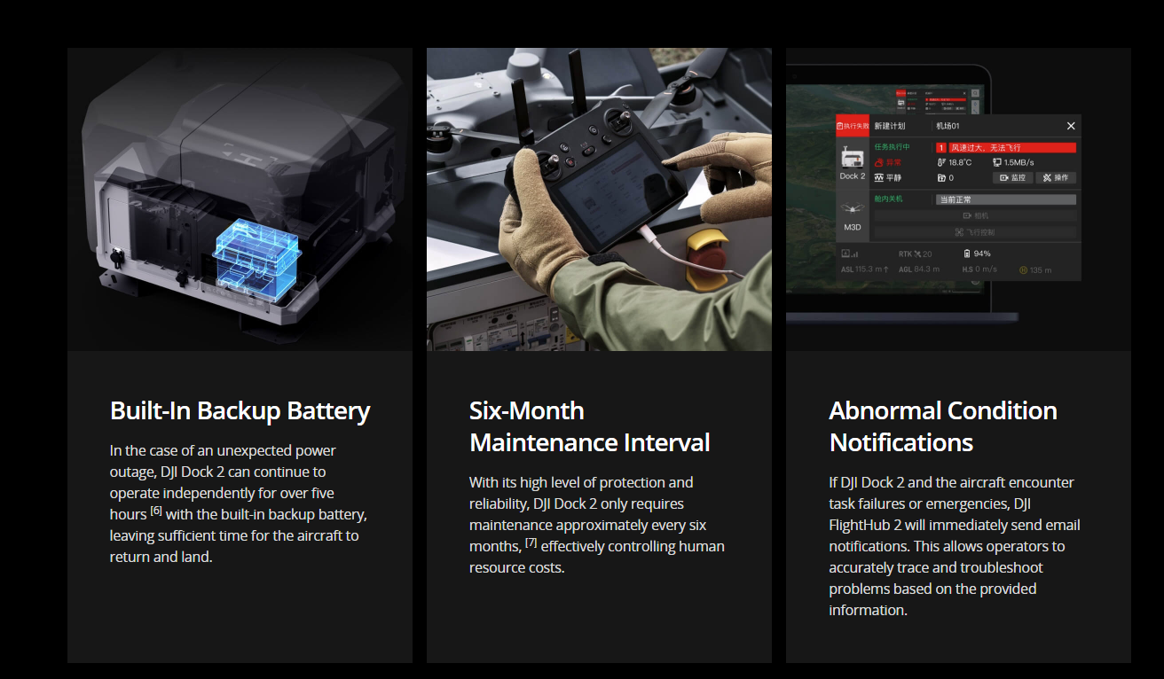 | Measured with a fully charged backup battery in a 25° C (77° F) environment. After a power outage, the dock does not support functions like aircraft charging, air conditioning, dock cover heating, and wind speed gauge heating. Always check malfunctions promptly. | |