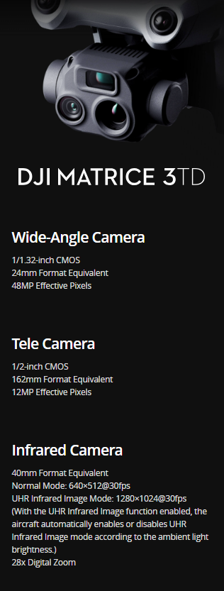 DJI Matrice 3TD is specifically designed for DJI Dock 2. Matrice 3TD, outfitted with a wide-angle camera, a tele camera, and an infrared camera, can depict both visible light and thermal images, making it suitable for security and inspection operations.