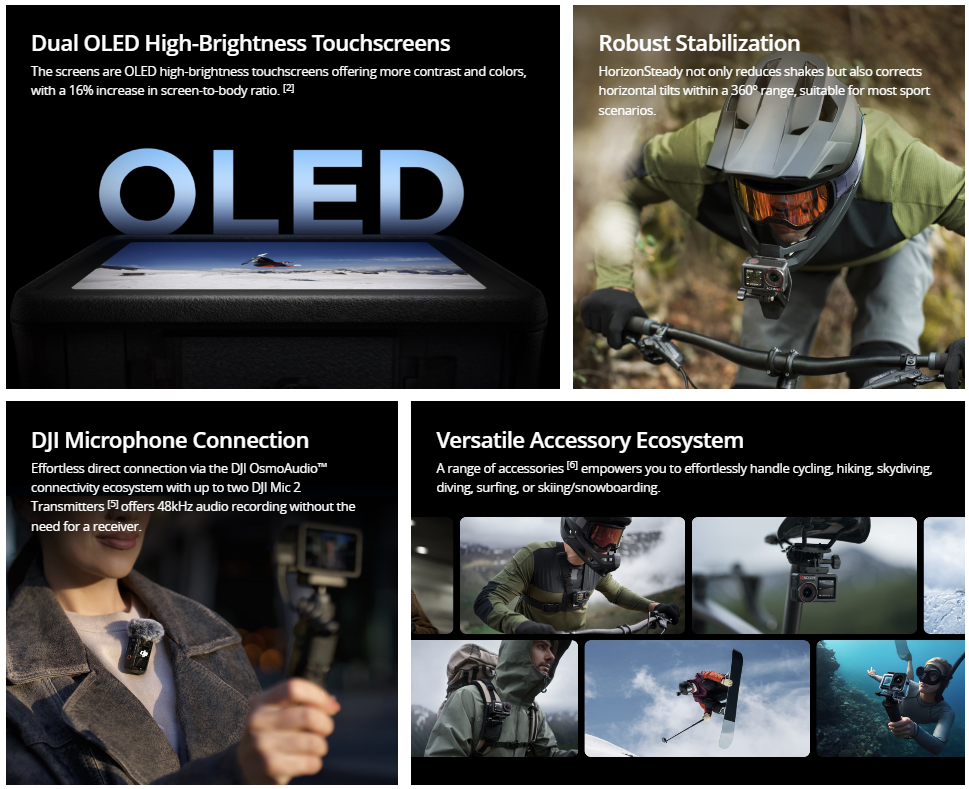 ** Data in the Osmo Action Series Product Comparison was collected in a controlled environment. Actual experience may vary. For details, refer to the corresponding product page on the official DJI website.