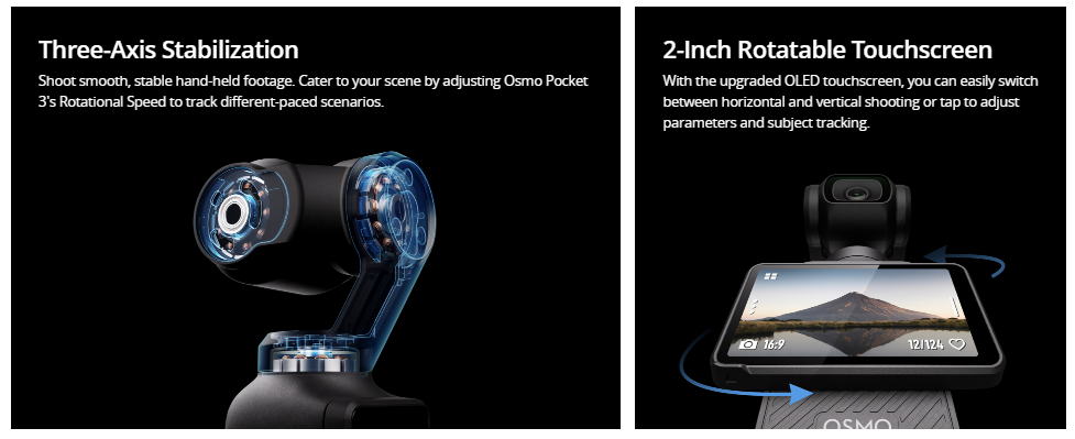 With a 2-inch full-color OLED touchscreen, Pocket 3 puts vibrant visuals and effortless control right at your fingertips. Rotate to start shooting or simply tap to access parameter adjustments and other functions.