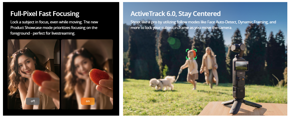 ActiveTrack 6.0 offers multiple follow modes, introducing Face Auto-Detect and Dynamic Framing, and you can produce smooth, cinematic footage with one hand.
