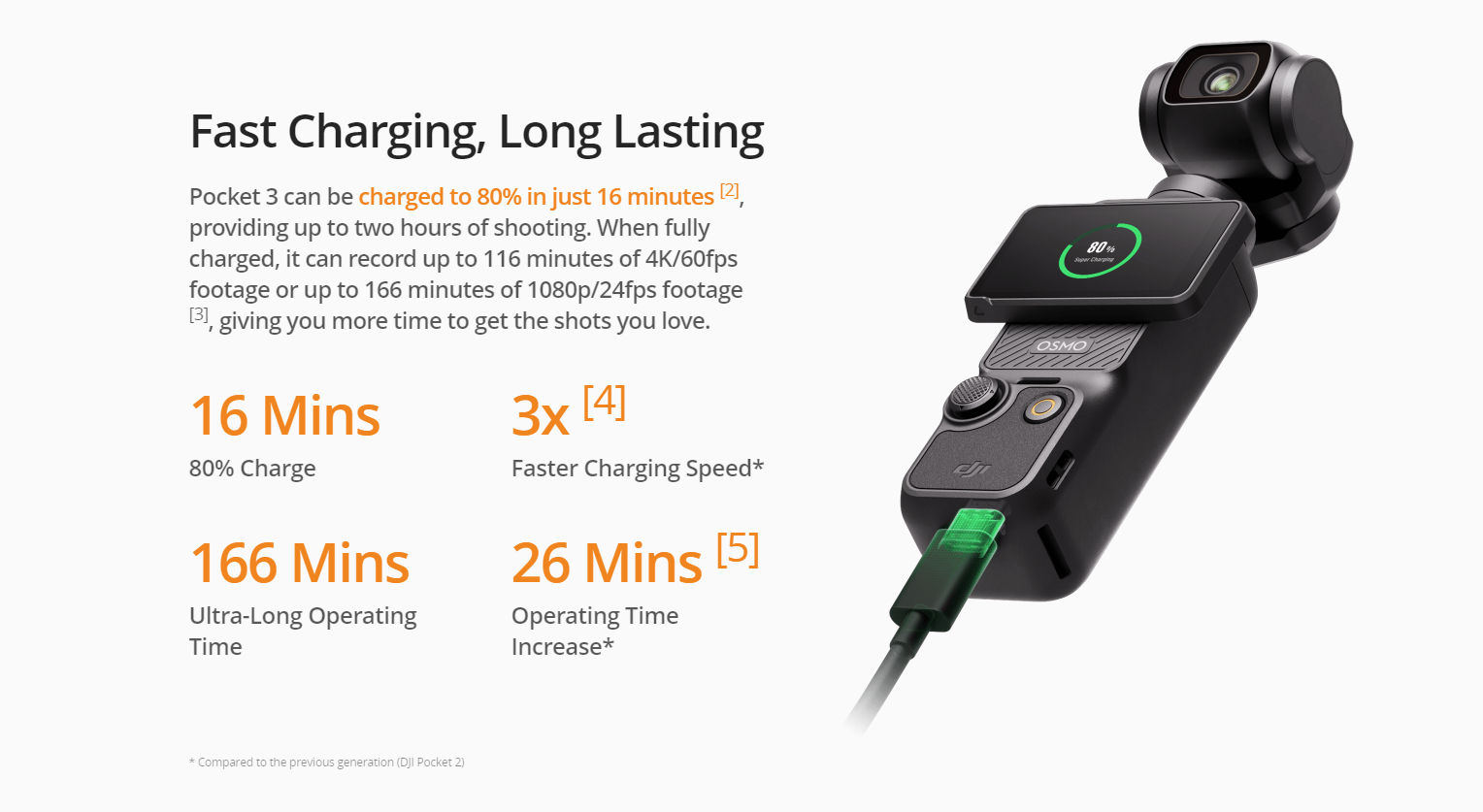 The all-new Pocket 3 features a powerful 1-inch CMOS sensor that puts detail-rich imaging right in the palm of your hand. With a 2-inch rotatable touchscreen and full-pixel fast focusing, go horizontal or vertical for more precise awareness and control. 4K/120fps, three-axis mechanical stabilization, and a host of intelligent features make Pocket 3 ready for any moving moment.