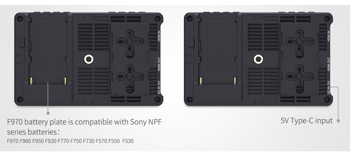A Sony F970 external install and power kit design is added to the back of the monitor. The external kit can be used to install and install the external equipment, like wireless transmitter, LED light, video converter and others which can be powered by Sony F970 battery. This innovative external power supply design reduces the need for photographers to connect to external wireless transmission, LED light and other equipment, greatly saving the space occupied by the equipment and reducing the weight of photography equipment.