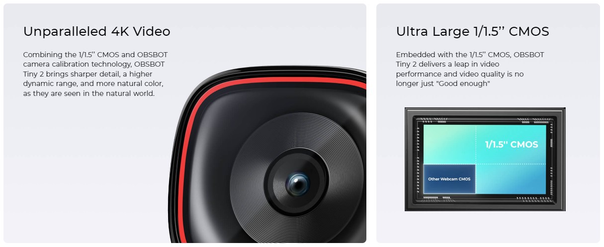 The Tiny 2 updates its features from the Tiny 4K in many areas, including a more powerful 1/1.5" CMOS 50MP sensor; updated AI auto-zoom, zone, and hand tracking with auto-framing; enhanced PixGain HDR support, dual-native ISO for high-quality low-light performance, 10x faster data transmission over USB 3.1 Gen 1, dynamic gesture control, and an enhanced sleep mode.