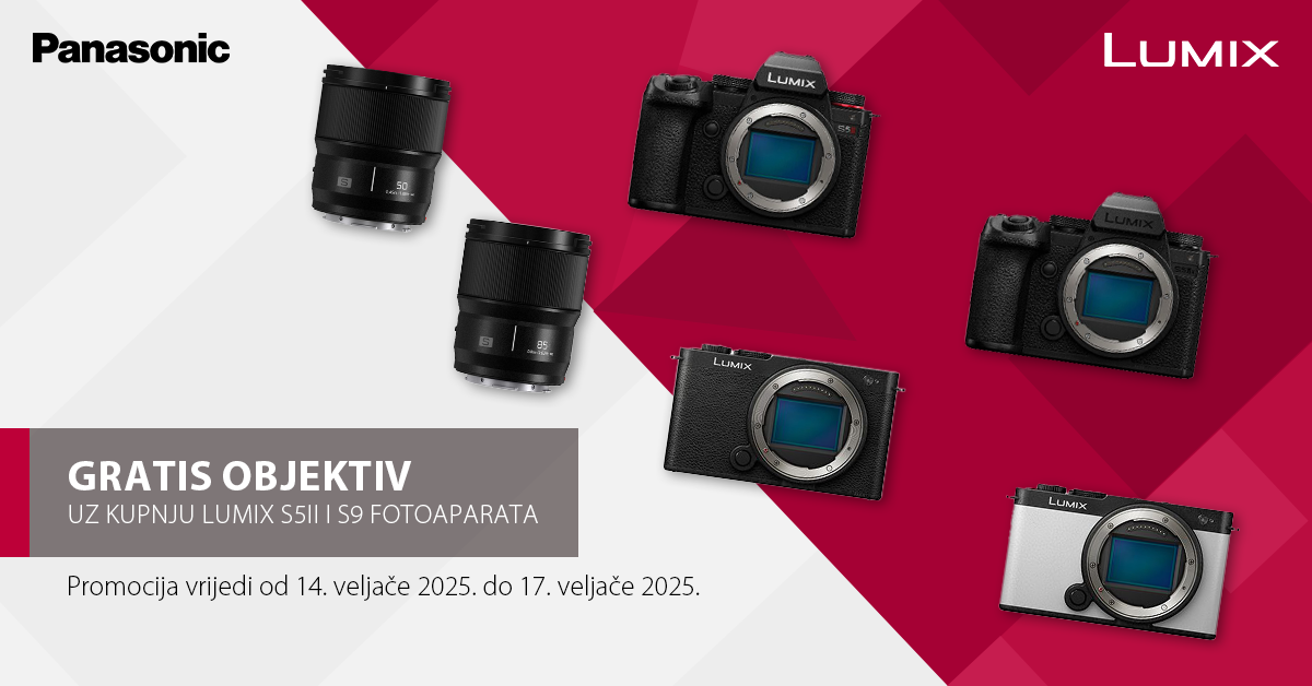 Uz kupnju određenih Panasonic Lumix S5 II fotoaparata, gratis dobivate Lumix S 85mm f1.8 objektiv, a uz Lumix S9 fotoaparate, gratis dolazi Lumix S 50mm f1.8 objektiv.