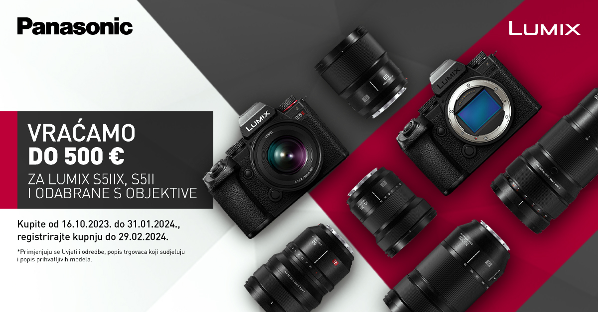Kupite neki od dolje navedenih LUMIX S fotoaparata ili objektiva serije S u razdoblju od 16.10. 2023. do 31. 01. 2024. te ostvarite povrat novca u iznosu do 500EUR. Iznos povrata ovisi u modelu kupljenog fotaparata i objektiva te su navedeni niže u tablici. Cashback zahtjev je potrebno registrirati do 29.02.2024. putem sljedećeg linka: Panasonic Cashback