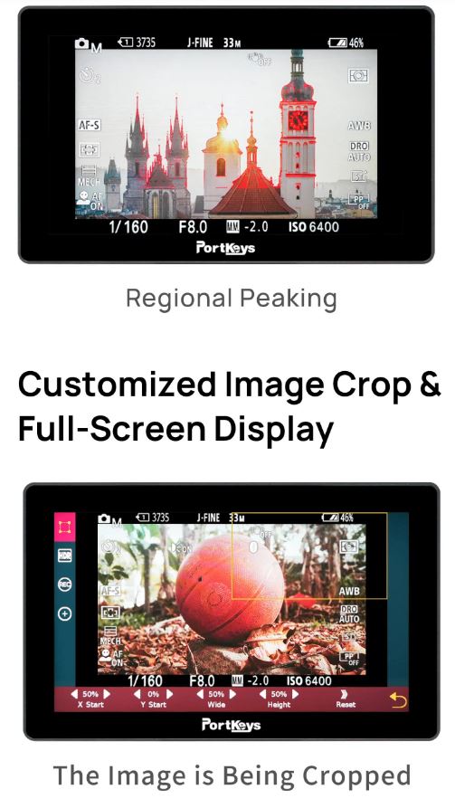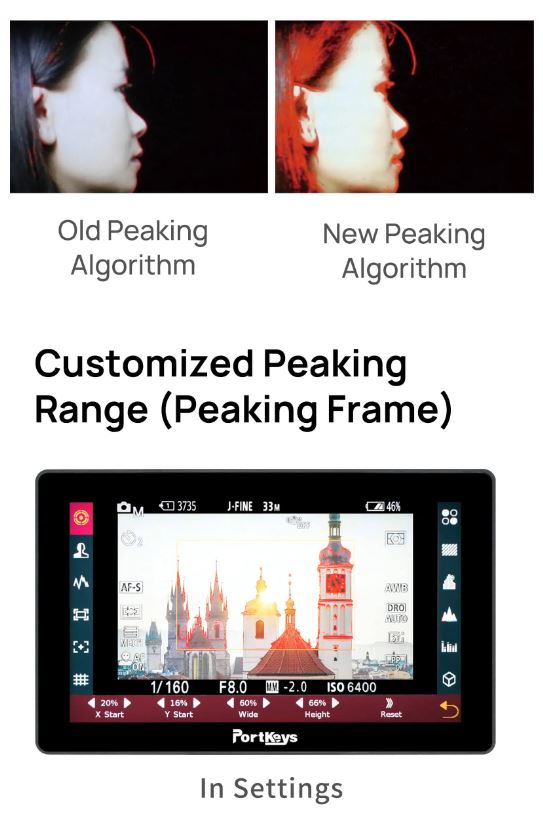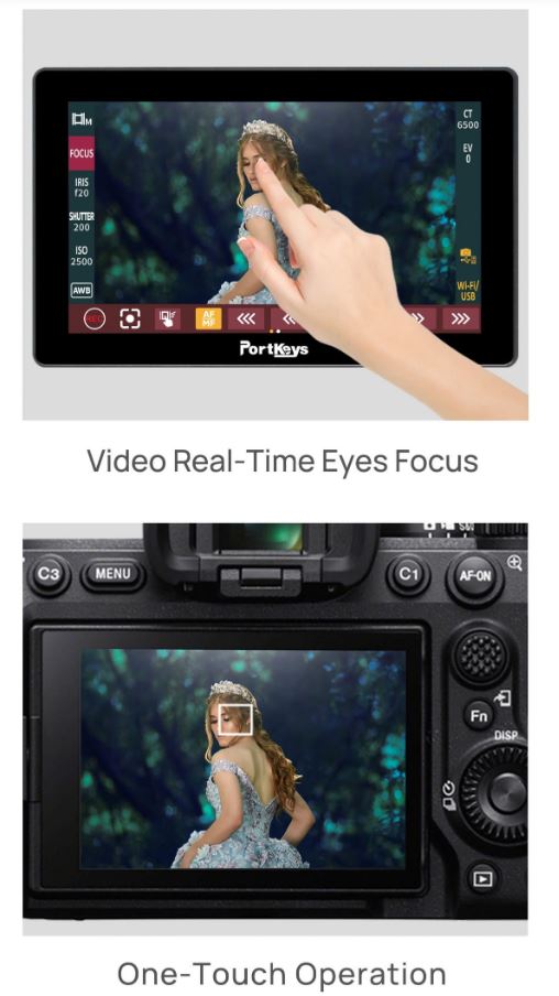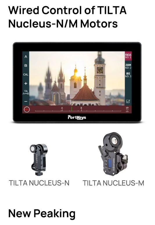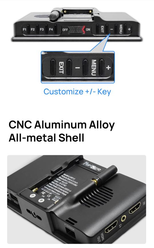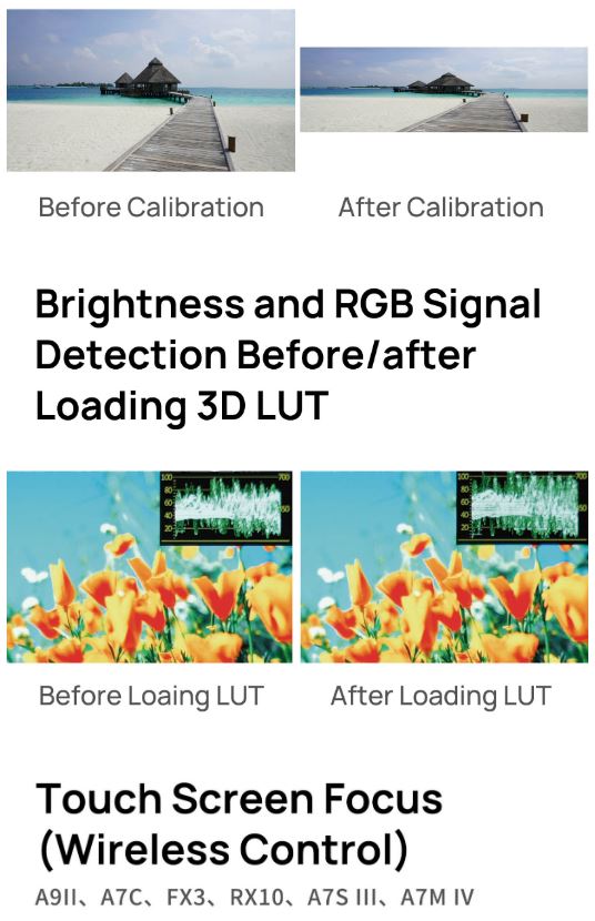 Wired/ wireless control Sony camera, F key can be set to camera REC key;, 2200nit 5.5inch touchscreen monitor. Factory calibration for Rec. 709, DCI-P3 85%, CNC aluminum alloy all-metal shell, Wired control Tilta Nucleus-N/M motor, New peaking, anamorphic lens calibration, customized peaking range( Peaking frame), Brightness and RGB signal detection before/after loading 3D LUT, real-time Eye focus while recording