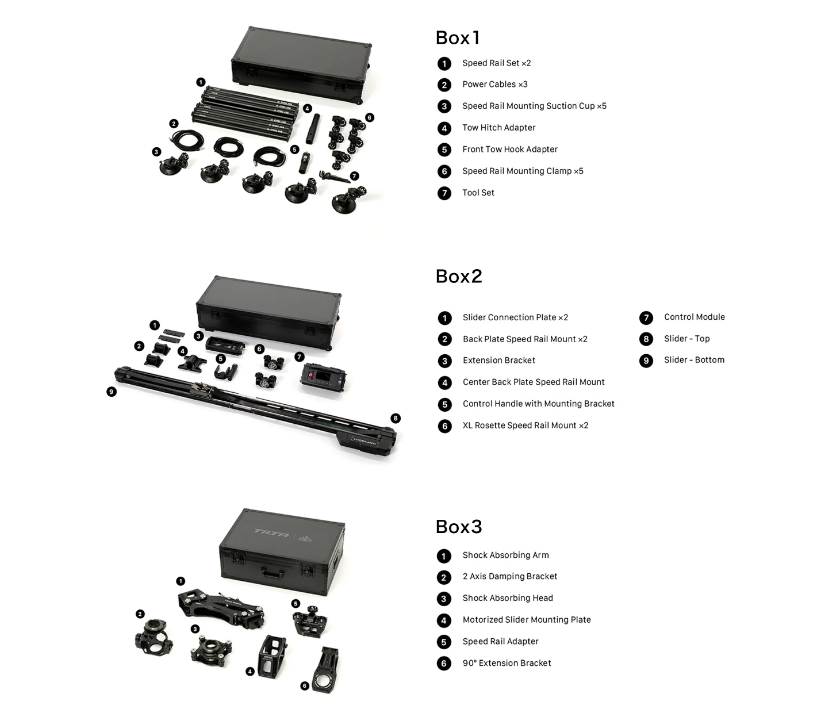 The slider comes in three parts and weighs 50 kg (110.2 lbs). The system fits into three compact cases and can be stored away in standard sized vehicles for transportation.