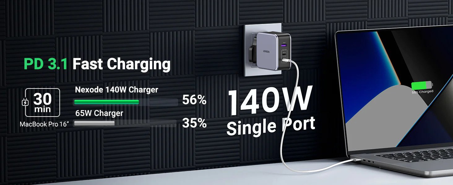 - MacBook Pro Hyper-Fast Charger: With a single port, PD 3.1 pumps up charging levels to 140W. Charge the MacBook Pro 16'' to 56% in 30 mins, 1.8X faster than a 65W USB C laptop charger.